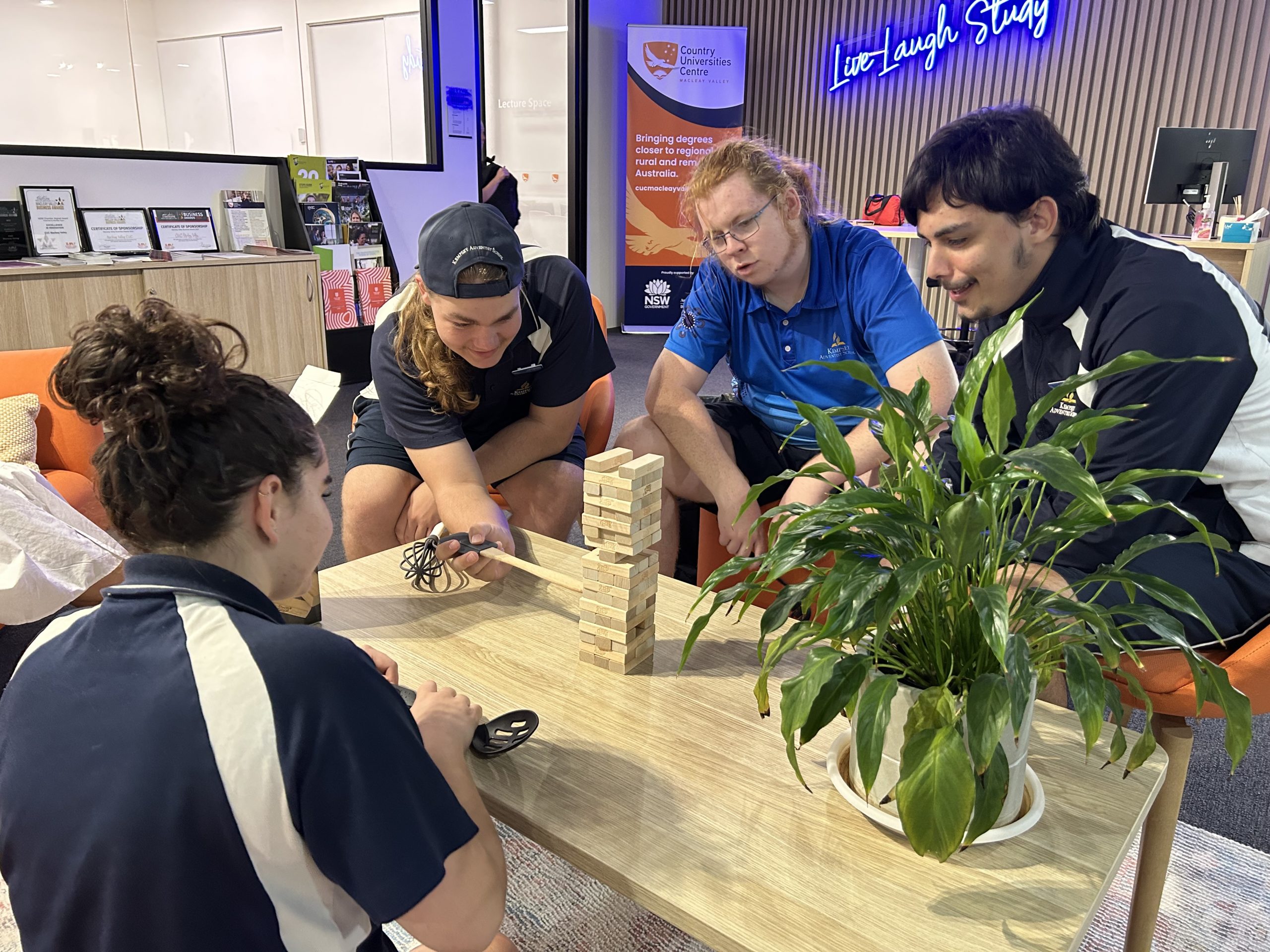 Students enjoying a game of Jenga during a study break at CUC Macleay Valley.